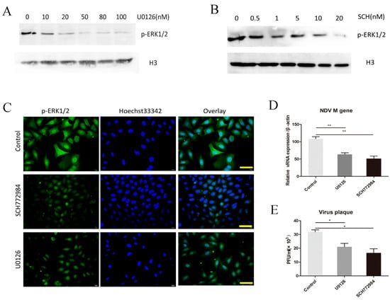 Figure 2. The extracellular signal-regulated kinase (ERK)1/2 inhibitors, U0126 and SCH772984, reduce NDV replication in HeLa cells. Cells were treated with various concentrations of (A) U0126 and (B) SCH772984. Lysates from treated cells were analyzed by Western blotting with the p-ERK1/2 antibody and H3 histone as a reference. (C) After treatment with 10 µM of the ERIK1/2 inhibitors, the expression of p-ERK1/2 protein in HeLa cells was detected using immunofluorescence (400×), bar = 50 μm. (D) HeLa cells were infected with NDV F48E9 (1 MOI) for 24 h and the quantitative reverse transcription polymerase chain reaction was used to measure viral RNA in cell lysates in control cells and cells treated with either 100 nM U0126 or 10 nM SCH772984, while (E) viral plaque formation was assessed to measure the number of viral particles in the supernatants. Data are presented as means ± SD of three independent experiments. * p < 0.05; and ** p < 0.01.