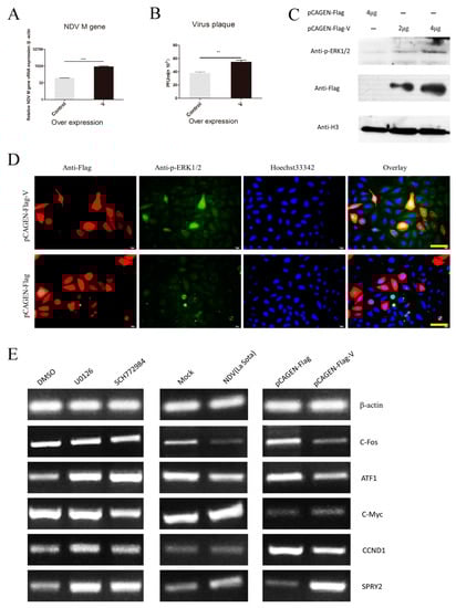 The V protein is known to benefit NDV replication [4,5]. We found that the V protein can reduce DF-1 cell apoptosis [51]. However, there were no studies focusing on which NDV protein(s) could trigger ERK signaling. The novel finding reported in Figure 3 is of relevance in the current study as we showed that the V protein triggers the phosphorylation of ERK1/2 and enhances NDV replication in HeLa cells. Further investigation is needed to determine how the V protein triggers the phosphorylation of ERK1/2 and which other viral proteins are involved in the viral replication regulatory mechanism.