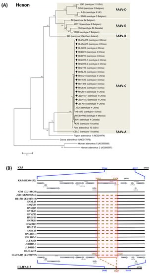 Based on the serotype-specific sequence of the L1 region of hexon, 17 novel genotype FAdV-4 strains were isolated and identified (Figure 1A) from chickens with severe HHS from different farms in three different provinces (Heilongjiang, Jilin, and Henan) of China. The similarity of the hexon sequence between the novel genotype FAdV-4 and each of the other FAdV-4 strains and other species of FAdVs was varied from 98.6–100% and 50.1–76.2%, respectively. The complete genome sequences of HLJFAd15 from layers and HLJDAd15 from ducks (identified as the novel genotype FAdV-4) were submitted to GenBank during our previous study [,]. The large genomic deletion 1966Del, located between ORF42 and 43, was sequenced and its absence confirmed in all of the other 15 clinical strains from chickens with emerged HHS, but did not appear in KR5 (HE608152) and ON1 (GU188428) isolated outside of China. (Figure 1B).