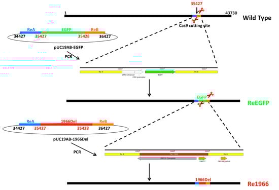 The left 1000-bp recombinant arm (ReA) and right 1000 bp arm (ReB) adjacent to the 1966Del site were amplified by PCR from the genomic DNA of HLJFAd15 and subsequently cloned into plasmid pUC19 (GenBank no. X02514) at the EcoR I and Kpn I enzyme sites separately to obtain pUC19AB. The enhanced green fluorescent protein (EGFP) cassette within a CMV promoter from pEGFP-N1 (Clontech Laboratories, Mountain View, CA, USA) and the relative 1966Del sequence of a non-pathogenic strain KR5 were synthesized from a commercial company (Genewiz, Nanjing, China) were cloned into pUC19AB between ReA and ReB by homologous recombination to obtain a non-gap connection ReA-EGFP/1966Del-ReB fragments contained in pUC19AB-EGFP or pUC19AB-1966Del.