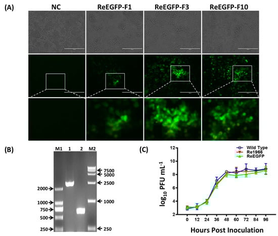 Recombinant viruses of ReEGFP and Re1966 with insertion of the EGFP expression cassette or the natural deletion 1966 bp sequence were both rescued by the CRISPR/Cas9 platform. The EGFP was able to continuously express in the rescued ReEGFP virus for at least 10 passages (Figure 4A). The insertion of 1966Del genomic part was also detected in the rescued Re1966 virus by PCR and stably propagated for 10 passages (Figure 4B). A 658 sequence was amplified by PCR from the wild-type strain, and a 2624 bp sequence with the insertion of 1966 bp was detected in the Re1966 strain. There was no significant difference in any of the in vitro growth properties among the rescued ReEGFP, Re1966, and wild-type strains (Figure 4C).