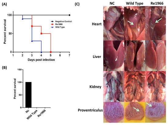 Analyses of the pathogenicity of the rescued Re1966 for SPF chickens. All of the SPF chickens were observed for 10 dpi. The chickens in the wild type and Re1966 strain groups died within 2 to 5 dpi (A), and the mortalities of both the groups were 100% (B). The survival time of chickens infected with Re1966 was greatly prolonged relative to that of the birds infected with the wild-type strain. (C) In the necropsy examination, all of the dead chickens in both infected groups showed severe hydropericardium syndrome, hepatitis (swollen and friable liver), proventriculus erosion, and kidney enlargement kidney, and there was no significant difference in these features between the two infected groups. All of the SPF chickens in the negative control group remained alive and did not show any clinical signs.