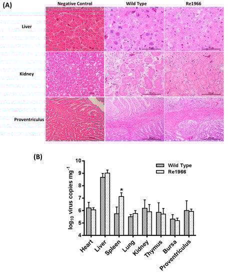 To investigate the different pathogenicities of the wild-type and Re1966 strains, sections of the liver, kidney, and proventriculus were stained with hematoxylin and eosin (HE) and examined using light microscopy (Figure 6A). Typical inclusion bodies were observed in the liver cells of chickens in both infected groups. Degeneration of partial renal tubular epithelial cells and congestion was observed in the kidneys. Partial lymphocyte necrosis appeared in the propria of the proventriculus mucous membrane. However, no significant differences in these features were observed between the infected groups. The distributions of the wild-type and Re1966 strains in different tissues were investigated (Figure 6B). The Re1966 strain showed the same distribution and replication kinetics as the wild-type strain in the different tissues of SPF chickens except for a higher number of virus copies in spleen (p < 0.05). None of the SPF chickens in the negative control group showed any histopathology changes, and virus DNA was not detected by real-time PCR in this group throughout the experiment.