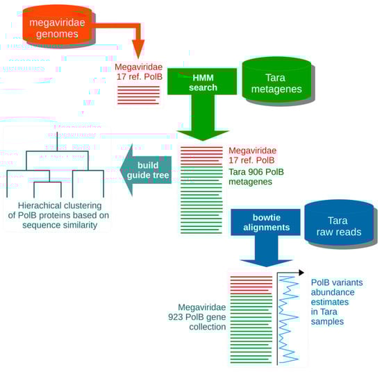 Schematic diagram of the building of the Megaviridae polB collection. This figure shows how the input data (reference Megaviridae genomes, Tara Oceans metagenes, and Tara Oceans raw reads) were used to produce a Megaviridae guide tree and a collection of 923 Megaviridae polB gene sequences.