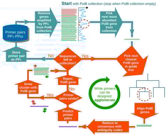 A general overview of the primer design strategy is provided in Figure 1 and Figure 2. A set of 17 reference PolB protein sequences translated from reference Megaviridae genomes (Table S1) were aligned with Multiple Alignment using Fast Fourier Transform (MAFFT) version 7.244beta (--thread -1 --genafpair --maxiterate 1000) []. Those 17 reference PolB sequences were obtained from all the 17 Megaviridae genomes that were available at the time of our primer design. The alignment of the corresponding 17 polB nucleotide sequences was obtained by threading the 17 reference gene sequences in the protein alignment using PAL2NAL version 14 []. Inspection of the nucleotide alignment suggested seven conserved domains (A–G, Figure S1), which might be suitable for designing oligonucleotide primers for PCR amplification. In order to enrich the 17-seed reference sequence alignment with additional diversity from the Tara Oceans metagenomes, we isolated six sub-regions (1–6) from the reference protein alignment and built six corresponding Hidden Markov Models (HMMs; Figure S1) using HMMER version 3.1b1 []. The primer design procedure described in Figure 2 produced the best results, meaning smaller number of primer pairs with best in silico PCR detection coverage of the Tara Oceans polB diversity. Therefore, when targeting the PolB domain G—which contains the location of AVS2 primer [] and LSB-e primer [], and does not show long insertions such as inteins in the reference sequences—the rest of the present procedure is described for the G domain only. The HMM N°6 identified 3537 putative polB genes out of a total 101,856,227 Tara Oceans metagenome assembled genes (European Nucleotide Archive (ENA) study PRJEB7988), of which 1230 were taxonomically assigned to the Megaviridae clade using Pplacer version 1.1.alpha16 [] using a phylogenetic reference tree inferred from PolB reference sequences representing a large diversity of cells and viruses. The 1230 Megaviridae polB metagenes were clustered at 100% identity with CD-HIT version 4.6.1-2012-08-27-2 (-c 1.0 -G 1 -M 12000 -T 6 -d 0 -p 1) [] yielding 990 non-redundant Megaviridae polB metagenes, including 232 full-length metagenes and 758 partial metagenes. The 990 PolB environmental proteins were aligned using MAFFT with the 17-seed reference Megaviridae PolB, and the sub-alignment region (346 amino acids) corresponding to domain G was extracted, yielding a Megaviridae PolB target collection of 923 sequences, supplemented with the PolB from Ostreococcus tauri virus 1 (OTV1) to serve as an outgroup. Partial metagenes that did not span the full domain G were excluded. In order to guide the agglomerative primer design iterative strategy (Figure 2), a guide tree was built with MAFFT (mafft --retree 0 --treeout --localpair -reorder) using the domain G PolB 924 sequence alignment. An estimation of the abundance of each of the 923 Megaviridae polB metagenes in the ocean was calculated by counting the number of Tara Oceans reads (ENA study PRJEB7988) mapped to each sequence using Bowtie Version 2.2.4 (--no-hd --no-unal -f -S) [] divided by the length of the polB sequence.