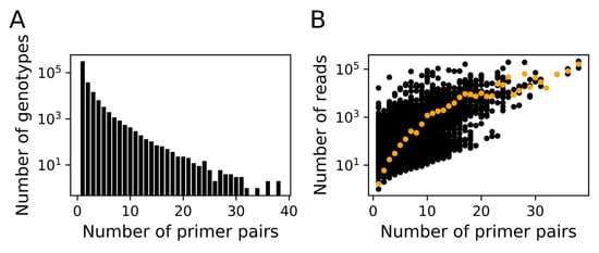 After trimming the extremities, the length of the reads ranged from 9 to 273 bp (210.6 bp on average; 99.99% were >150 bp). The merged reads were then grouped into 381,722 genotypes by clustering at 100% sequence identity. Reads supporting a genotype were found to result from one or more PCR reactions (i.e., a single genotype could be amplified by different primer pairs), although most genotypes (313,133; 82%) were revealed by a single PCR reaction. The number of identified genotypes decreased with increasing number of primer pairs that amplified individual genotypes (Figure 3A), whereas the number of reads supporting individual genotypes increased (Figure 3B).