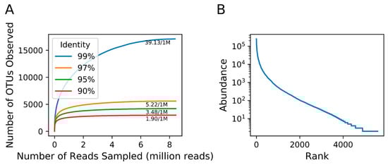 Megaviridae operational taxonomic units (out) richness. (A) Rarefaction curves for Megaviridae polB OTUs with various DNA sequence identity cutoffs. Proximity to saturation is indicated by weak slopes at the end of each rarefaction curve. For instance, an increase in 39.13 OTUs per resampling of one million reads is noted as 39.13/1M. (B) Rank abundance curve of Megaviridae polB OTUs at 97% DNA sequence identity. Y-axis represents the number of reads supporting individual OTUs.