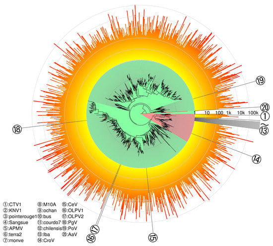 - Hingamp, P.; Grimsley, N.; Acinas, S.G.; Clerissi, C.; Subirana, L.; Poulain, J.; Ferrera, I.; Sarmento, H.; Villar, E.; Lima-Mendez, G.; et al. Exploring nucleo-cytoplasmic large DNA viruses in Tara Oceans microbial metagenomes. ISME J. 2013, 7, 1678–1695. [Google Scholar] [CrossRef] [PubMed]