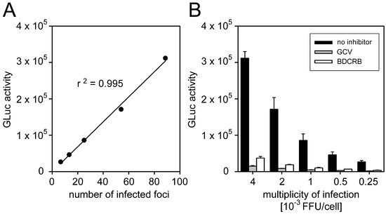 Inhibition of focal growth reflected by Gaussia luciferase (GLuc) activity. Human foreskin fibroblasts (HFFs) were seeded and infected with Merlin-pAL1502-GLuc in a dilution series in the range of 0.00025–0.004 focus-forming units/cell (FFU/cell) resulting in six to 80 infected foci per well. The following day, infected cell cultures were treated with either human cytomegalovirus (HCMV)-seronegative human plasma, or two direct-acting antivirals ganciclovir (GCV) or 2-Bromo-5,6-dichloro-1-β-d-ribofuranosyl benzimidazole (BDCRB). Six days after infection, viral immediate-early (IE) antigens were detected by immunofluorescence staining to determine the number of infected foci per well. Additionally, the GLuc activity of cell-culture supernatants was measured. (A) Correlation between immunofluorescence-based readout and luciferase readout. (B) Detection of reduced focal growth in antiviral-treated cultures by the luciferase readout at various infection multiplicities. Bars represent the mean values of triplicates and error bars indicate the standard error of the mean (SEM).