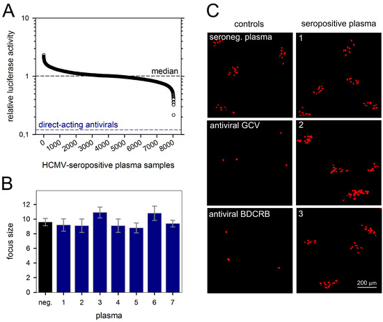 The mean relative luciferase activity of the antiviral controls was around 0.12 (=12%), reflecting maximal inhibition of focal growth. None of the plasma samples reached this value, indicating that none of them could substantially block cell-to-cell spread of the Merlin strain (Figure 2A). Nevertheless, seven out of the 14 top scorers in the luciferase screening were randomly selected (representing relative luciferase activities between 0.22 and 0.50) and re-evaluated for cell-to-cell spread inhibition in an immunofluorescence-based assay that visualized viral IE antigen in the nuclei of infected cells and thereby allowed to assess focus size at 6 d p.i.. None of these seven plasma samples notably reduced focal growth of strain Merlin when compared to HCMV-seronegative control plasma, whereas formation of foci was completely blocked by direct-acting antivirals (Figure 2B,C). Obviously, the few hits that had at least a partial effect in the screening assay represented statistical outliers rather than true biological activity against the cell-associated spread of HCMV.