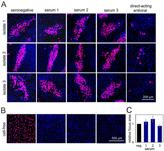 Sera with highly neutralizing capacity against cell-free HCMV transmission cannot inhibit cell-associated spread of clinical isolates in fibroblasts. (A) Fibroblasts infected with cell-associated clinical HCMV isolates were cocultured with an excess of uninfected HFFs, and, the following day, sera with highly neutralizing capacity against cell-free HCMV transmission were added to the coculture. Addition of seronegative human serum or a direct-acting antiviral served as a negative or positive control, respectively. Cocultures were then incubated for six days more to allow for cell-associated viral spread, followed by fluorescence staining for viral IE antigens (red signal). Nuclei of cells were stained with DAPI (blue signals). Three representatives out of six tested sera are shown. (B) To prove their neutralizing capacity, sera were mixed with HCMV-TB40/E-BAC4 (MOI 1) and incubated for 2 h. Fibroblasts were then infected with the serum-virus mixture. The next day, IE antigens were detected via indirect immunofluorescence staining (red signals). (C) For the three sera shown in panel A, focus areas were determined and compared with the negative control. For each serum, the bar represents the mean value of the three isolates (four to seven foci evaluated per isolate). Error bars represent the SEM.