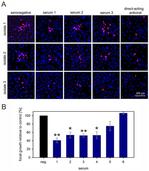 Frozen stocks of HFFs, which were infected with clinical HCMV isolates and stored at low passages, were thawed, washed, and cocultured with an excess of uninfected HFFs or HEC-LTTs in 96-well microplates (Cellstar, Greiner Bio-One). This resulted in 50–100 infected cells per well surrounded by 15,000 uninfected indicator cells. Directly after seeding, highly neutralizing sera from previously identified “elite” donors [37] were added to the coculture at a final dilution of 1/50. The direct-acting antiviral ganciclovir (GCV, 800 µM) or serum from an HCMV-seronegative donor (dilution 1/50) was used as positive or negative control, respectively. After 6 days of cocultivation, cells were fixed with 80% acetone, and IE antigen was detected via immunofluorescence staining. It is noteworthy that plasma samples repeatedly had cytotoxic effects on HEC-LTT cultures during the 6 days of incubation, and, therefore, we had to use serum instead of plasma.