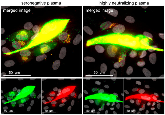 First of all, our findings with the seronegative plasma supported the assumption of high infection multiplicity during cell-to-cell transmission of HCMV. Between 10 and more than 50 virions were found on cells in the surroundings of late-stage infected cells, and the majority of these virus particles accumulated at the nuclei of the respective cells. Most of them did not contain an envelope signal, as indicated by the fact that they only had a green signal but lacked red fluorescence (Figure 5).