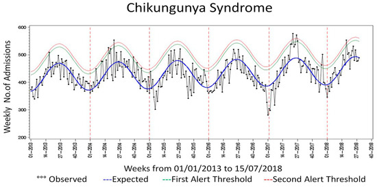Number of Emergency Department (ED) admissions expected value and alert threshold for Chikungunya Virus (CHIKV) Syndrome. Blue Line, Expected number of ED admissions; Green Line, upper 95% confidence interval for the expected number of ED admissions (first alert threshold); Red Line, upper 99% confidence interval for the expected number of ED admissions (second alert threshold).