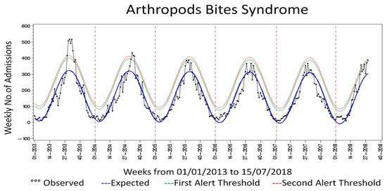 Probably due to the high underreporting of fever during the ED admission, the “CHIKV syndrome with fever” has not produced reliable results. As shown in Figure 1, applying the new “CHIKV syndrome” to the previous year, two alerts are present during the 2017 summary. No alert was present for the “CHIKV syndrome with fever”. Regarding the arthropod bites syndrome (Figure 2), the seasonality in the frequency of insect bites is clearly shown, which peaks in the summer period.