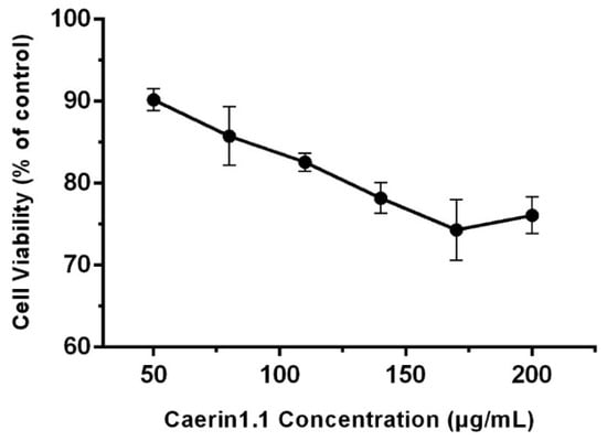 The cytotoxicity of Caerin1.1 in Vero cells grown in 96-well culture plates was assessed by MTT (3-(4,5-dimethyl-2-yl)-2,5-diphenyltetrazolium bromide, 5 mg/mL) assay. The cells were incubated with Caerin1.1 at different concentrations for 72 h, then 20 μL/well MTT was added and cultured for additional 4 h. The supernatant was then removed and dimethylsulfoxide (DMSO) was added to culture plates (150 μL per well), then the plates were shaken at room temperature (RT) for 10 min. Finally, the optical density (OD) value was measured at the wavelength of 490 nm [].