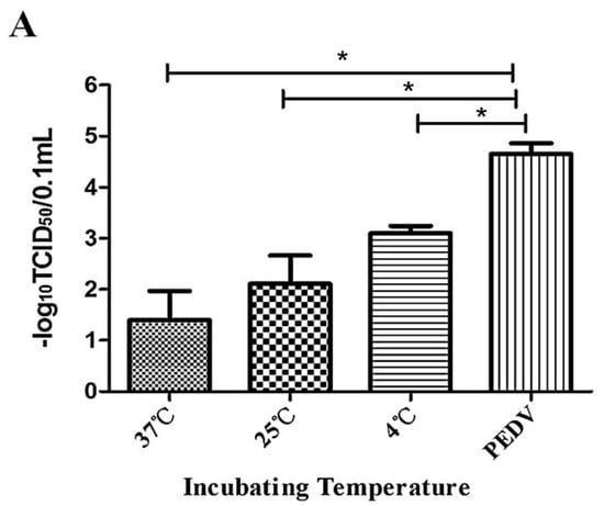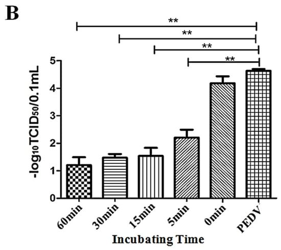 Different incubating conditions of PEDV in the presence of Caerin1.1 can directly affect the antiviral activity of Caerin1.1. In this experiment, we determined the titer of PEDV under different incubating temperatures and time durations. The results showed that the most suitable incubating temperature was 37 °C, shown in Figure 2A, and time length was 1 h, shown in Figure 2B. Low temperature and inadequate incubation time would obviously affect the inhibition activity of Caerin1.1 against PEDV.