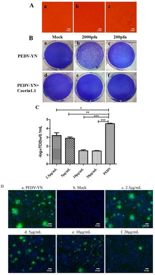 The inhibitory effect of Caerin1.1 against porcine epidemic diarrhea virus (PEDV)-YN strain. (A) (a) mock-infected cells, PEDV-infected Vero cell morphology in the presence (10 μg/mL) (b) or absence (c) of Caerin1.1; (B) The number of plaques (clear spots) observed represents the number of viruses in a given dilution (a) Mock-infected cells; Cells infected with PEDV titer of 2000 pfu (b) and 200 pfu (c); (d) cells treated with 10 μg/mL Caerin1.1; Cells infected with PEDV titer of 2000 pfu (e) and 200 pfu (f) in the presence of Caerin1.1 (10 μg/mL); (C) The titer of PEDV was detected under the treatment of different concentration of Caerin1.1 (2.5, 5, 10, 20 μg/mL) after one hour. The control groups (PEDV) were not treated by Caerin1.1. The results of three independent experiments are presented as the mean ± SD. The statistical analysis was performed using Graph Pad Prism5.0. The significance was defined as p < 0.05 (*), and the higher significance was defined as p < 0.01(**), p < 0.001(***); (D) Fluorescence intensity of PEDV in the presence of Caerin1.1 at different concentration. (a) Cells infected with PEDV of 200 pfu; (b) Mock-infected cells; PEDV were incubated with Caerin1.1 of 2.5 (c), 5 (d), 10 (e) and 20 (f) μg/mL for 1 h. Scale bar, 20 µm.