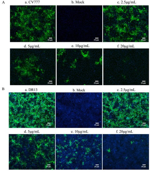 The inhibitory effect of Caerin1.1 against CV777 (A) and DR13 (B) strains. Fluorescence intensity of CV777/DR13 strain in the presence of Caerin1.1 at different concentrations. (a) Cells infected with porcine epidemic diarrhea virus (PEDV) of 200 pfu; (b) Mock-infected cells; PEDV were incubated with Caerin1.1 at the concentrations of 2.5 (c), 5 (d), 10 (e) and 20 (f) μg/mL for 1 h. Scale bar, 20 µm.