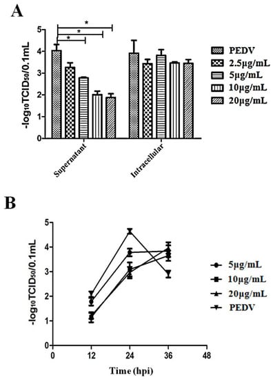 The inhibitory effect of Caerin1.1 against the progeny virus production of porcine epidemic diarrhea virus (PEDV). (A) The intracellular and extracellular progeny virus titers were detected after treatment with different concentration of Caerin1.1. The concentration of Caerin1.1 used in the experiments are 2.5, 5, 10, 20 μg/mL, respectively; (B) The progeny virus (extracellular virus) titers were also detected under treatment with different concentration of Caerin1.1 (5, 10, 20 μg/mL) at different time points (12, 24, 36 h). The results of three independent experiments are presented as the mean ± SD. The statistical analysis was performed using Graph Pad Prism5.0. The significance was defined as p < 0.05 (*).