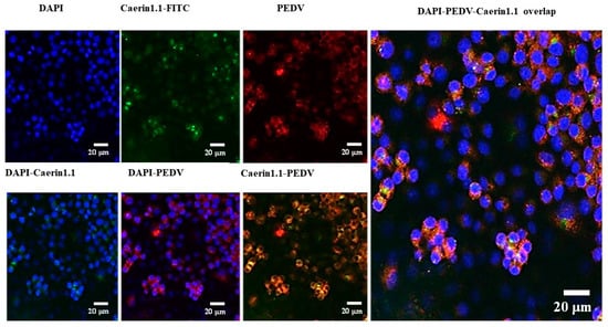 Vero cells were seeded onto some glass coverslips and were separately treated with FITC-Caerin1.1 (100 μg/mL), PEDV (200 pfu), and both FITC-caerin1.1 (100 μg/mL) and PEDV (200 pfu), then incubated at 37 °C for 12 h. Cells were fixed with 4% formaldehyde followed by permeabilization for 30 min with 0.1% Triton X-100, and were blocked with 1% BSA for 1 h. The cells were washed 3 times with PBS at each step. Cell nuclei were counterstained with 0.01% 4′,6-diamidino-2-phenylindole ((DAPI), Invitrogen), and the antibodies used here were: PEDV-S monoclonal antibody (made in our laboratory) and Alexa Fluor 594-conjugated Affinity Pure Donkey Anti-Mouse IgG (H+L) (Ant Gene, Wuhan, China). The samples were examined using a confocal microscope (LSM 510 Meta, Carl Zeiss, Munich, Germany) [].