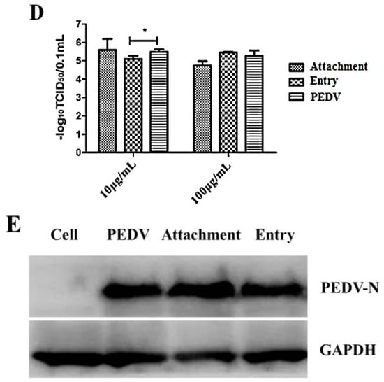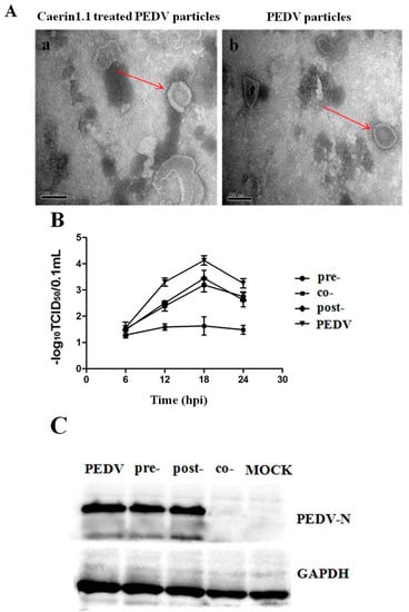 Cells were pre-chilled at 4 °C for 1 h before infection and were chilled again after inoculated with PEDV for 3 h, then the cells were washed with ice cold PBS 3 times, replenished with DMEM containing trypsin, were incubated at 37 °C for 72 h, and the inhibitory effects were determined by TCID50. Caerin1.1 was separately added at two time points: together with PEDV at the time of viral absorption, and after the cells were washed at the time of viral entry to reach a highest final concentration of 10 μg/mL. The cell lysates were processed in the same procedures with western blot analysis [].