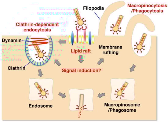 After attachment and binding to cell surface molecules, baculovirus appears to be internalized by cells through lipid rafts []; this is supported by the observation that treatment with methyl-β-cyclodextrin, which removes cholesterol from cellular membranes, inhibits GP64-mediated internalization but not attachment to the cell surface []. On the other hand, the internalization pathway is still controversial, although it has been speculated to involve clathrin-mediated endocytosis [,,] and/or macropinocytosis [,]. Laakkonen et al. reported that baculovirus is internalized by cells through dynamin-dependent phagocytosis but not through clathrin-mediated endocytosis or macropinocytosis, by the knockdown and expression of mutants of regulators of each pathway in HEK293 cells and HepG2 cells []. However, treatment of cells with inhibitors, gene knockdown or the expression of dominant-negative mutants for dynamin- and clathrin-mediated endocytosis has been shown to abrogate the internalization of AcMNPV into Huh7 cells, while inhibition of caveolin-mediated endocytosis had no effect []. In addition, inhibition of macropinocytosis reduced GP64-mediated internalization []. Collectively, these results indicate that cholesterol in the plasma membrane, dynamin- and clathrin-dependent endocytosis, and macropinocytosis play crucial roles in the entry of viruses bearing baculovirus GP64 into mammalian cells, but the internalization pathway may be dependent on cell type (Figure 1).
