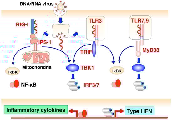 - Kawai, T.; Akira, S. Innate immune recognition of viral infection. Nat. Immunol. 2006, 7, 131–137. [Google Scholar] [CrossRef] [PubMed]
