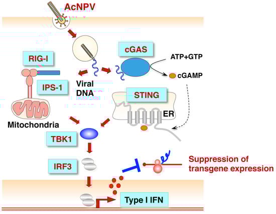 On the other hand, with respect to baculovirus-mediated gene delivery into mammalian cells, the induction of an antiviral immune response suppresses an efficient transgene expression []. Previously, we examined the effects of the innate immune responses on gene expression by recombinant baculoviruses in mouse embryonic fibroblasts (MEFs) []. Although the innate immune response against unmethylated CpG DNA was mediated by the TLR9/MyD88 signaling pathway in macrophages or DCs [,], the production of type I IFN and inflammatory cytokines in MyD88-deficient MEFs infected with the recombinant baculovirus was not significantly different from that of the wild type, resulting in the suppression of reporter gene expression. On the other hand, reporter gene expression was enhanced in accordance with the suppression of IFN-β production in stimulator of IFN genes (STING)-, TANK binding kinase 1 (TBK1)-, IFN-β promoter stimulator 1 (IPS-1) or IRF3-deficient MEFs, but not in those deficient for Z-DNA binding protein 1 (ZBP1)/DAI or IRF7. A cyclic GMP-AMP (cGAMP) synthase (cGAS) has been reported as a candidate for an upstream cytosolic DNA sensor of STING [,]. In the cGAS-STING signaling axis, cGAMP produced by cGAS acts as a second messenger in cells stimulated by cytosolic DNAs, activates STING, and is involved in the antiviral response against DNA viruses [,]. Recently, it has been reported that RAB2B-GARIL5 complex, which participate in activation of the cGAS-STING signaling pathway, inhibits the expressions of IFN-β and CXCL10 induced by baculovirus and by a modified vaccinia virus Ankara strain (MVA) []. These results suggest that the cGAS/STING/TBK1/IRF3 and IPS-1/TBK1/IRF3 signaling axes contribute to the antiviral response in mammalian non-immune cells upon infection with recombinant AcMNPV (Figure 3).