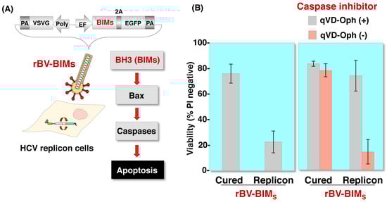 Induction of apoptosis in cells replicating HCV RNA by a recombinant baculovirus expressing a proapoptotic protein. (A) Structure of a recombinant baculovirus, rBV-BIMS, carrying cDNAs of BIMs 2A peptides, and enhanced green fluorescent protein (EGFP) under the control of the elongation factor 1α promoter. The apoptosis pathway was induced by BIMs. (B) HCV replicon cells (HCV-RNA-replicating Huh7 cells) and cured cells (replicon cells from which HCV-RNA was eliminated) were infected with rBV-BIMS at an MOI of 500, and cell viability was determined at 24 h post infection. rBV-BIMS can induce apoptosis more efficiently against HCV replicon cells than cured cells (left). HCV replicon cells and cured cells were infected with rBV-BIMS at an MOI of 500 in the presence or absence of 20 μM qVD-Oph (caspase inhibitor), and cell viability was determined at 24 h post infection. The results show that infection with rBV-BIMS selectively induced apoptosis in HCV replicon cells through the activation of Bcl-2 family proteins (right).