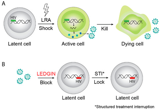 Examples of HIV cure strategies. (A) The “shock-and-kill” strategy aims to reactivate latent provirus followed by killing of activated cells by viral cytopathic effects on the host immune system. (B) The “block-and-lock” functional cure strategy aims to permanently silence latent reservoirs, for instance by LEDGIN-mediated retargeting of integration to sites that are less susceptible to reactivation after interruption of combination antiretroviral therapy (cART). LRA is latency reversing agents.