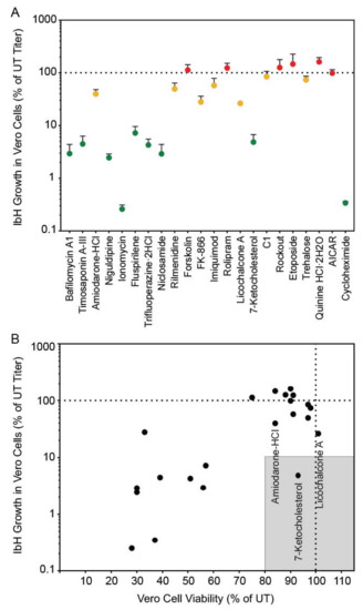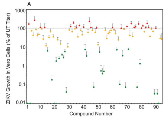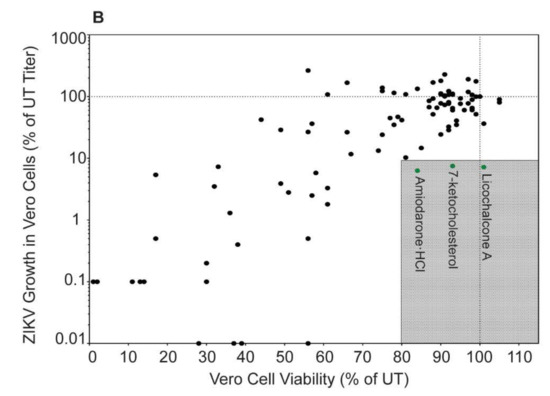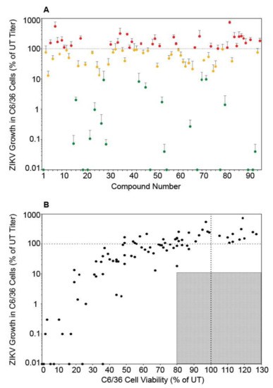African- lineage ZIKV IbH growth in compound-treated Vero cells as a percent of ZIKV titer in untreated Vero cells (A). The color-codes are the same as in Figure 1A. (B) ZIKV IbH growth in Vero cells versus viability of compound-treated Vero cells. The shaded box represents the zone in which ZIKV titer is reduced to 10% or lower than the untreated control and cell viability is at least 80% of control.