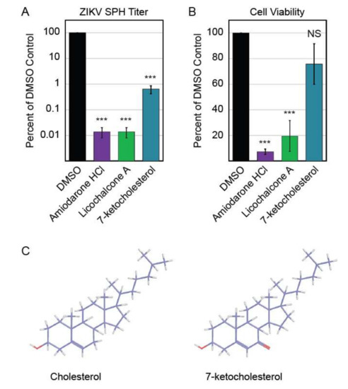 The three compounds that reduced ZIKV titer without impacting Vero cell viability were further characterized to determine these compounds’ abilities to inhibit ZIKV replication in human neurons, a cell line more relevant to clinical ZIKV infection. We performed this screen with neurons derived from human neural progenitor cells, which have been characterized in previous ZIKV experiments [20]. Of these three compounds, only 7-ketocholesterol (7-KC) reduced ZIKV titer without significantly decreasing neuron viability (Figure 4A,B). Structurally, 7-KC is very similar to cholesterol, a major component of cellular membranes; the only difference between the two compounds is an extra oxygen molecule on 7-KC compared to cholesterol (Figure 4C). The addition of a cholesterol-like molecule could alter cellular membrane composition, which could block one of the many stages in ZIKV replication that relies on membranes, including entry, genome replication, or budding from the host cell.