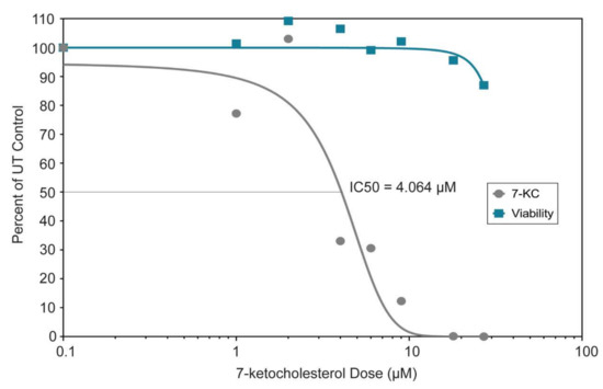 Dose-response curve and viability of Vero cells treated with varying doses (0–27 µM) of 7-ketocholesterol. The curves were generated by GraphPad Prism version 7.04 using the log (inhibitor) vs. normalized response variable slope regression. The regression curve estimates the IC50 at 4.064 μM (R2 = 0.9078). The cell viability did not drop below 80% preventing us from determining the EC50.