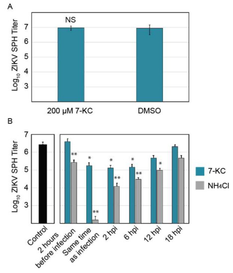 Vero cells at a density of 3 × 105 cells/well in 24-well plates were treated with either 10 µM of 7-KC or 30 mM of ammonium chloride under the following conditions: 2 h prior to ZIKV infection, at the same time as ZIKV infection, 2 h following ZIKV infection, or 6 h following ZIKV infection. Regardless of treatment condition, the cells were infected with ZIKV SPH MOI 0.1 for 2 h. After 2 h, the infectious media was removed and replaced with fresh media. For the cells treated at the same time as infection, the fresh media was re-treated with the compounds at the same concentrations as above. The supernatants were collected at 24 hours post infection (hpi) and titers were reported in TCID50 units. ZIKV titers from treated cells were compared to those from controls, which were treated with either DMSO or DMEM at the time of infection and retreated after the media change.