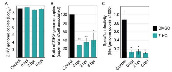 Time-of-addition experiments demonstrate that 7-KC is able to reduce virus production even when added 6 h following infection, suggesting that the compound most likely affects ZIKV production late in the infection cycle. To examine the levels of viral RNA production, we isolated total RNA from infected cells and quantified the number of viral genome copies present. The levels of ZIKV RNA were not significantly altered in the presence of 7-KC (Figure 7A), suggesting 7-KC does not alter RNA production. Although the levels of RNA found in the cells were not significantly different, the number of viral genome copies in the supernatant was reduced, suggesting a budding or release defect. When we compared the number of genomes in the supernatant to the amount in the cells, 7-KC treatment decreases budding/release efficiency to approximately 30% of untreated cells (Figure 7B). While this defect could account for a slight decrease in virion production, it alone could not cause the greater than 90% decrease in infectious virions. Therefore, we hypothesized that the particles budding from the 7-KC treated cells may be less infectious than ZIKV produced from untreated cells. We determined the specific infectivity of the particles by comparing the infectious titer to the number of genome copies in the supernatant samples (Figure 7C). Particles produced in cells treated with 7-KC were significantly less infectious than the DMSO control. Only 1 in approxiamately 9000 genomes were infectious when 7-KC was present compared to 1 in 1200 of control.