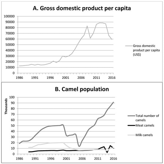 Most people in Qatar live in urban areas. The percentage of residents living in cities increased from 85.3% in 1960, to 90.4% in 1986, and 99.3% in 2016 [20]. Doha, the capital and the biggest city of Qatar, hosts the greatest number of people. However, there has also been a large increase in number of people living in the Al-Rayan area, where most of the camel farms are located. The number of tourists visiting Qatar also increased, especially since 2000. Most tourists came from other GCC countries, but the number of visitors from Europe and America were also increasing (Figure 2D) [20,27].