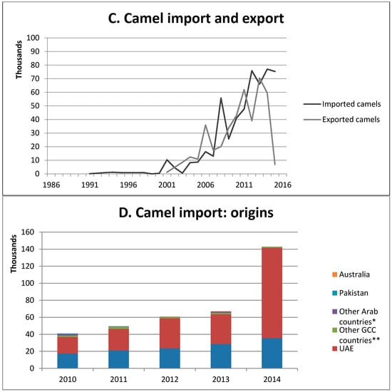 An unprecedented, increasingly intensified mobility of camels inside and outside Qatar has been seen over the recent decades. The domestic and cross border mobility does not only involve camels, but also people who look after the camels to provide care along the journey. Import and export of camels have especially increased since the year 2000 (Figure 1C). The imported camels mainly come from the UAE and KSA (Figure 1D).