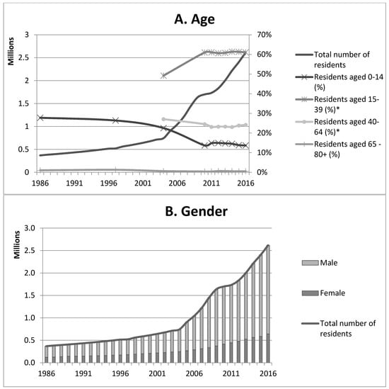 The thriving economy was paralleled by major demographic and life style changes. In the late 1950s, around 16,000 people lived in Qatar [22]. In response to demands for a larger workforce after the exploitation of oil and gas began, foreign laborers started to migrate to Qatar from countries in the region, like Palestine, Oman, Iran, and the Kingdom of Saudi Arabia (KSA). Later, immigrants from Pakistan, India, Nepal, Sri Lanka, Bangladesh, the Philippines, and Indonesia joined the older migrant populations, increasing the number of inhabitants to 369,079 by 1986 and recently to 2,617,634 (Figure 2A) [23]. In 2016, non-Qatari males made up 78% of the residents of working age (15-64) and non-Qatari made up more than 90% of the total number of Qatar inhabitants older than 15 years of age (Figure 2B,C) [24]. Most recent estimations of the origins of the non-Qatari population are that 25% is Indian, 11% Bangladeshi, 14% Nepali, 10% Filipinos, 9% Egyptian, 5% Pakistani, and 2% Iranian [25]. The total number of males in Qatar increased from 67.2% of the total population in 1986 to 75.5% in 2016 (Figure 2B). In 2004, almost 50% of residents were between 15 and 39 years old, and this has risen to more than 60% in 2015 (Figure 2A). Detailed accounts on age distribution were not available before 2004 [26].