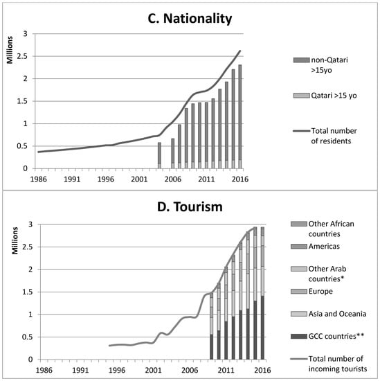 Developments in human demography in Qatar; (A) Development over time of the age structure of the population; (B) Development over time of the human sex ratio; (C) Development over time of the ration Qatari vs. non Qatari; (D) Development over time of tourism per country of origin *Other Arab countries: Algeria, Comoros, Djibouti, Egypt, Iraq, Jordan, Lebanon, Libya, Mauritania, Morocco, Palestine, Somalia, Sudan, Syria, Tunisia, and Yemen. **GCC countries: Bahrain, Kuwait, Oman, Qatar, KSA, and the United Arab Emirates.