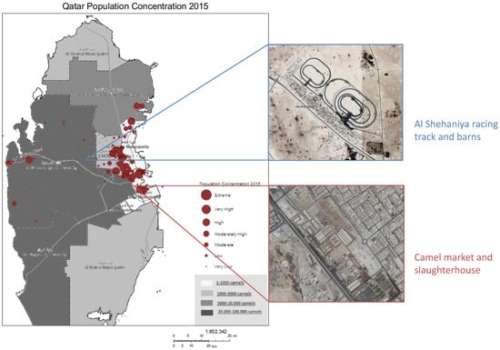 Human and camel density map of Qatar (adapted from Ministry of Development Planning and Statistics, Population Concentration map, 2015). The density map shows the density of camels (source: Ministry of Municipality and Environment) and humans in Qatar. Most people live in and around Doha, where the Doha animal market and slaughterhouse are also located. The highest camel density can be found in the Al-Rayyan area, where the Al-Shehaniya racing tracks are also located. A small, but growing, part of the Qatar population also lives in the Al-Rayyan area.