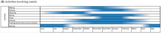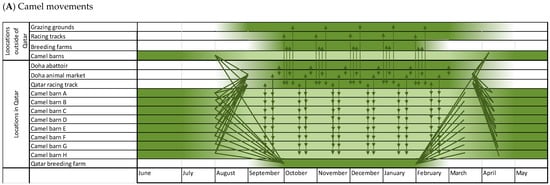 Seasonality and movements of camels and camel activities. (A) Dark green locations and periods of time indicate a high concentration of camels. The arrows show the direction of camel movements. It is shown that many camels gather and mix at the animal market, racing track, and breeding farms in Qatar in August, September and October. Moreover, there is constant movement to and from grazing grounds and racing tracks outside of Qatar. In March and April, most camels travel back to their barns. (B) shows the seasonality of camel related activities. Most activities take place in the “cold season” from September to April.