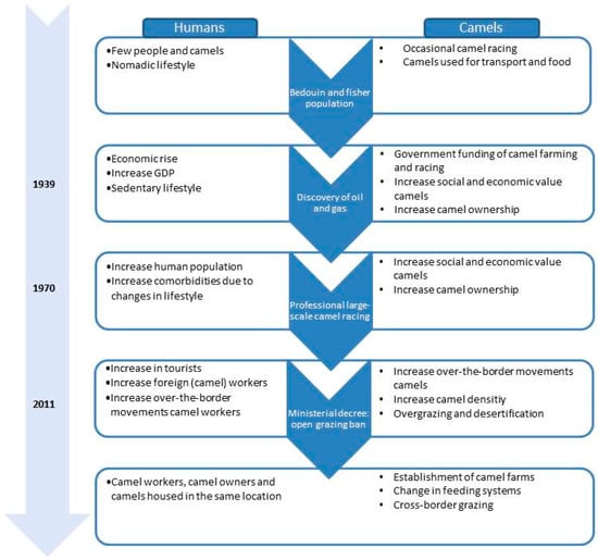 Several key changes were shown to involve camels, humans, the economy, and the environment in Qatar during the last 30 years. Our study indicates that the rapid increase in camel ownership, leading to the presence of camels from different origins in a high-density environment mixed together with human and other animal species may have offered the right circumstances for the virus to spread from camels to humans. The other key changes that were described collectively contributed to this situation. Further understanding of the drivers that led to the emergence of MERS-CoV can serve as input for MERS-CoV surveillance and control measures to prevent further spread of MERS-CoV and reduce transmission from camels to humans.
