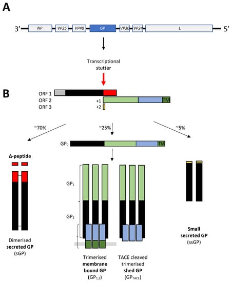 Ebolavirus glycoprotein. (A) The Ebolavirus genome comprises 7 genes that encode the nucleoprotein (NP), viral proteins 35 (VP35), 40 (VP40), 30 (VP30), and 24 (VP24), the polymerase (L), and four glycoproteins (GP), each transcribed from monocistronic RNA. (B) The GP gene encodes four products, three of which are generated by transcriptional stuttering at a centrally located polyuridine (poly-U) domain that results in the use of three different open reading frames (ORF1, ORF2 and ORF3). These products (sGP, GP1,2, GPTACE, ssGP) are produced at the frequencies noted next to the arrows in part B.