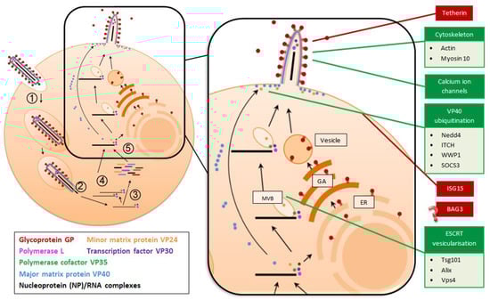 Filovirus replication cycle showing host and viral proteins that either promote (green boxes) or block (red boxes) virion assembly and release. Following viral attachment and entry into the host cell (1), the nucleocapsid, containing genomic RNA, is released into the host cell cytoplasm (2) and transcription of filovirus genes (3) and genome replication occurs. Replication is catalysed by the polymerase and viral cofactors NP, VP30 and VP35 (4). In the magnified diagram (5), nucleocapsids are transported to the plasma membrane by hijacking endosomal sorting complexes required for transport (ESCRT) machinery and the multivesicular body (MVB) trafficking pathway. Simultaneously, the major matrix protein, VP40, oligomerises as it moves towards the plasma membrane, while the full length glycoprotein is sent to the endoplasmic reticulum (ER) and Golgi apparatus (GA) for processing and is subsequently transported in vesicles to the plasma membrane in its trimeric form. Nascent virions assemble at lipid rafts and bud from the host cell. In the case of Marburg virus, budding occurs from actin filopodia. Host factors that promote viral egress (green boxes) include actin and myosin, calcium ion channels, neural precursor cell expressed developmentally down-regulated protein 4 (Nedd4), Itchy E3 ubiquitin protein ligase (ITCH), WW domain-containing E3 ubiquitin protein ligase 1 (WWP1), suppressor of cytokine signaling 3 (SOCS3), tumor susceptibility gene 101 (Tsg101), ALG-2-interacting protein X (Alix), and vacuolar protein sorting 4 (Vps4). Host factors that interfere with viral egress (red boxes) include tetherin, interferon stimulated gene 15 (ISG15) and BCL2 associated athanogene 3 (Bag3).
