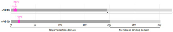 Domain organisation of EBOV and MARV VP40. VP40 is composed of a C-terminal membrane binding domain and an N-terminal oligomerisation domain. The late (L) domain PTAP and PPEY motifs are denoted in pink. Motifs were obtained from EBOV VP40 (eVP40) and MARV VP40 (mVP40) uniprot database entries (Q05128 and Q1PD51, respectively).