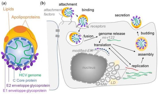 - Dubuisson, J.; Cosset, F.-L. Virology and cell biology of the hepatitis C virus life cycle: An update. J. Hepatol. 2014, 61, 3–13. [Google Scholar] [CrossRef] [PubMed]