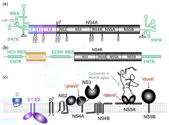 The NTRs contain the main cis-acting elements that are essential for genome translation and replication, including an internal ribosomal entry site (IRES) in the 5′ NTR (Figure 2a) [33,34]. An abundant liver specific miRNA, miR-122, interacting with these sequences was demonstrated to regulate HCV RNA levels in cell culture, stimulating translation and genome replication [35,36]. This microRNA acts in an unconventional way by recruiting Argonaute 2 to the 5′ end of the viral genome, stabilizing and protecting it from degradation by 5′ exonucleases [37]. As it is essential for HCV replication, it was identified as a potential antiviral target. The viral RNA is also the template for viral replication that produces positive genomes used for additional protein production and viral assembly through a negative-sense intermediate (Figure 1b). NS5B is the viral RNA-dependent RNA polymerase (vRdRp), the key enzyme of RNA synthesis. When subgenomic replicons were first established (Figure 2b), the minimal translation and replication machinery was demonstrated to require the NTRs and NS3/4A, NS4B, NS5A in addition to NS5B [38]. As described below, these replicons were invaluable tools for early anti-HCV drug screening and discovery.