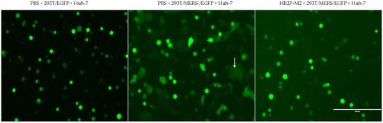 MERS-CoV S protein-mediated cell–cell fusion was performed as previously described []. Briefly, plasmid pAAV-IRES-MERS-EGFP encoding the MERS-CoV S protein was transfected into 293T cells (293T/MERS/EGFP) using the transfection reagent, VigoFect (Vigorous Biotechnology, Beijing, China). The target Huh-7 cells expressing DPP4were incubated at 2 × 104 cells/well in wells of a 96-well plate for 12 h. The effector 293T/MERS/EGFP cells that express MERS-CoV S protein and EGFP or the control 293T/EGFP cells that express EGFP only were preincubated at 104 cells/well with an inhibitor at the indicated concentration or phosphate buffered saline (PBS) as control at 37 °C for 30 min. The mixture of 293T/MERS/EGFP cells and an inhibitor or PBS were added to Huh-7 cells in the wells, followed by a co-culture at 37 °C for 2 h. The 293T/MERS/EGFP cells fused or unfused with Huh-7 cells were fixed with 4% PFA and counted under an inverted fluorescence microscope (Nikon, Tokyo, Japan). The fused cell showed much larger size and weaker fluorescence intensity than the unfused cell because of the diffusion of EGFP from one cell to more cells (Figure 1). Almost no fused cells could be observed in the groups of negative control (PBS+293T/EGFP+Huh-7) or peptide treatment (HR2P-M2+293T/MERS/EGFP+Huh-7) (Figure 1). The concentration for 50% inhibition (IC50) was calculated using CalcuSyn software kindly provided by Dr. T.C. Chou [].