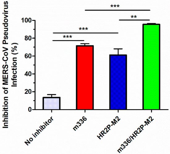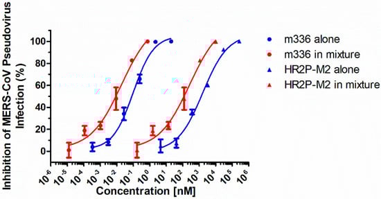 3.5. Sera from Mice Treated with the m336/HR2P-M2 Combination Showed More Efficacy in Inhibiting MERS-CoV Pseudovirus Infection than Either HR2P-M2 or m336 Alone
